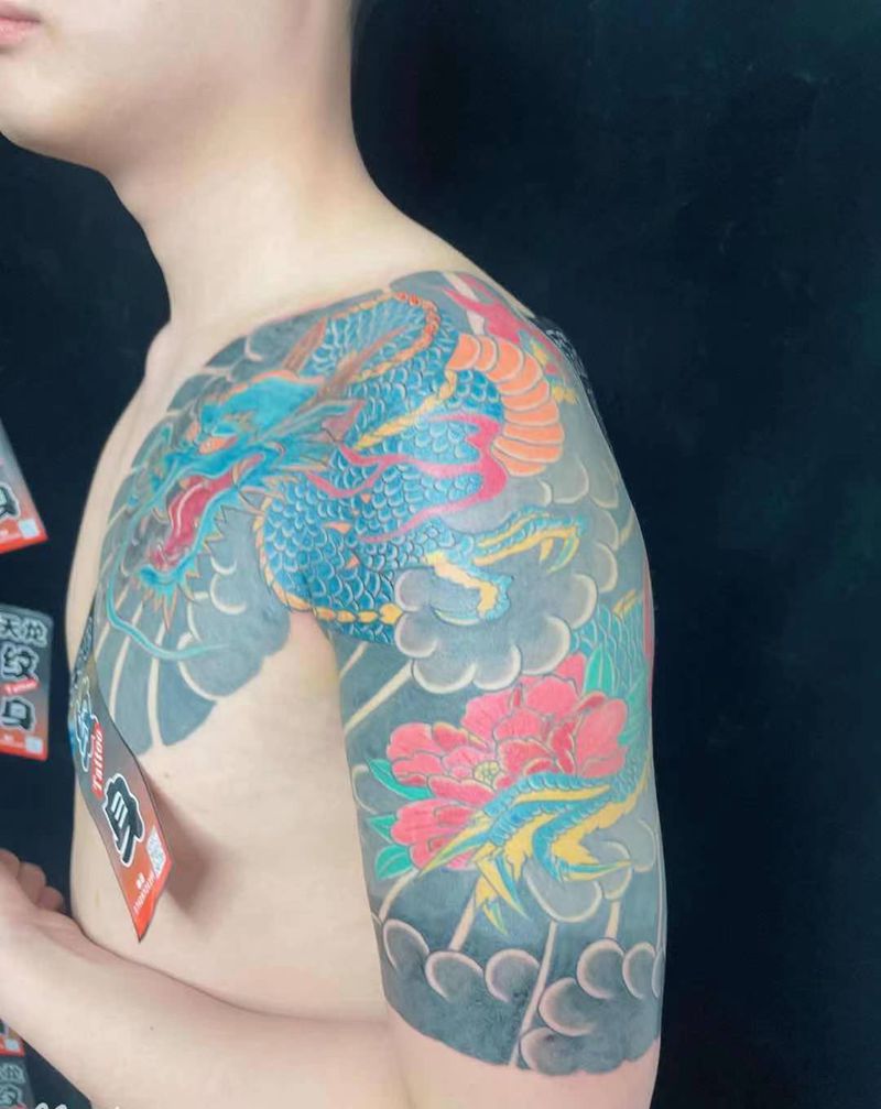 半甲青龙纹身图片_胸部肩部老传统新传统纹身图案