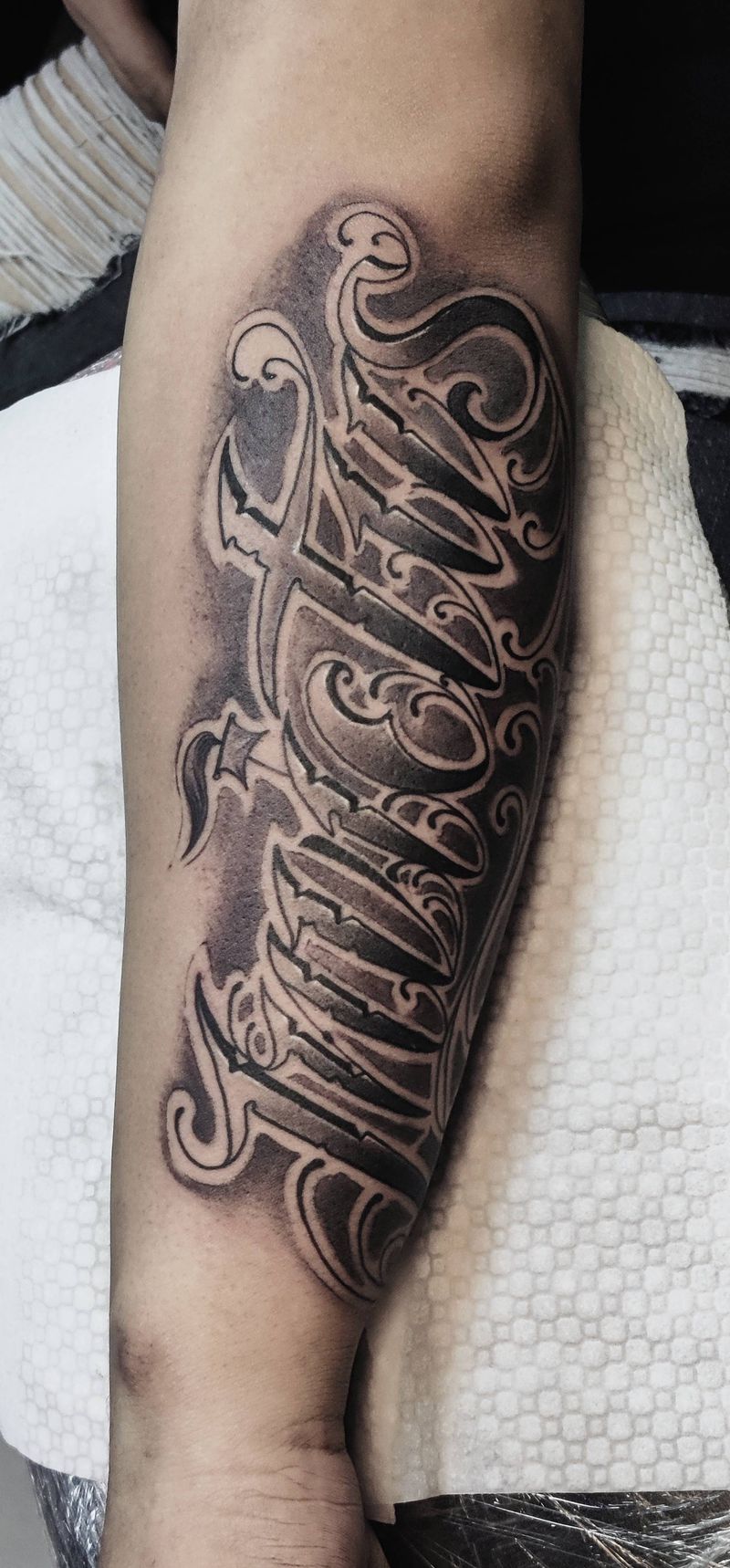 当前位置: 首页 >河南省郑州市纹身店-三木纹身工作室纹身图案>独立设计花体字纹身图片_手臂花体字纹身图案