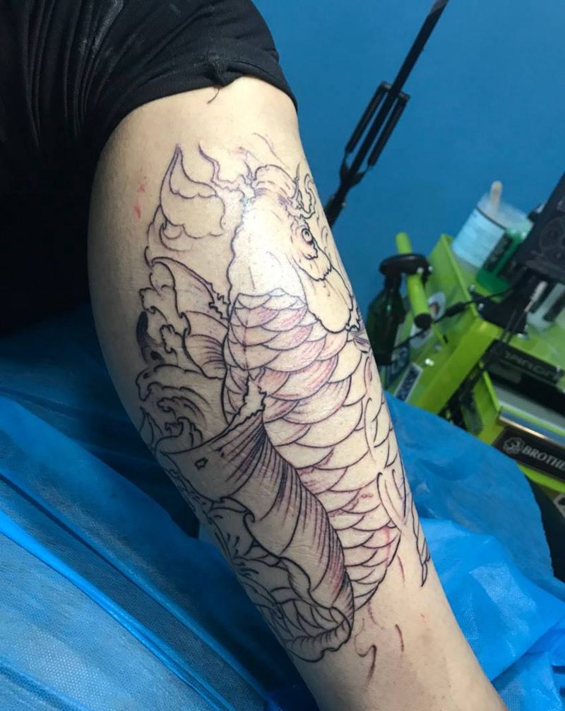 • T网红王老大花腿龙纹身图片_腿部新传统纹身图案