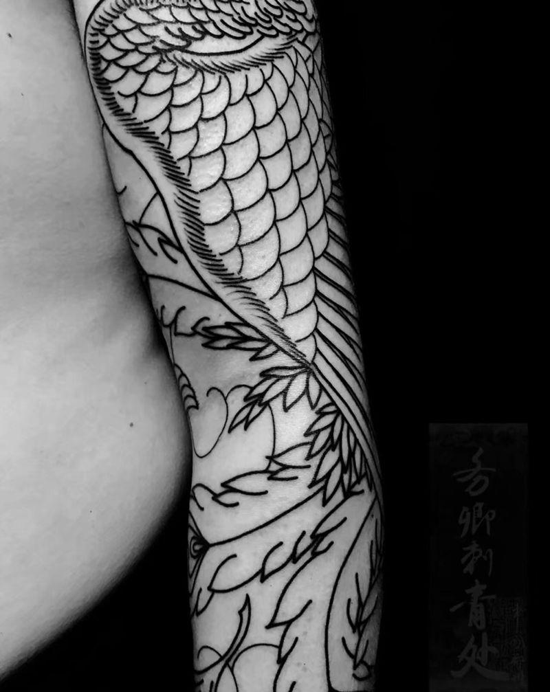 当前位置: 首页 >河南省郑州市纹身店-务卿刺青处纹身图案>花臂凤凰割线纹身图片