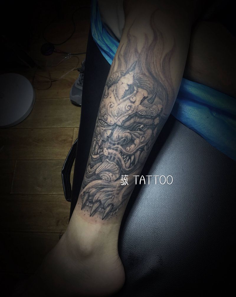 当前位置: 首页 >河南省郑州市纹身店-骇刺青工作室纹身图案>《破》纹身图片_腿部新传统唐狮石雕神兽纹身图案