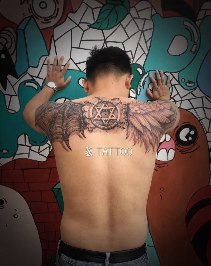当前位置: 首页 >河南省郑州市纹身店-骇刺青工作室纹身图案>《挣》纹身图片_背部肩部欧美写实六芒星翅膀纹身图案