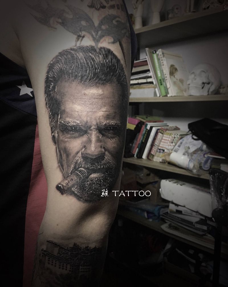 当前位置: 首页 >河南省郑州市纹身店-骇刺青工作室纹身图案>花臂局部纹身图片_手臂欧美写实人物纹身图案