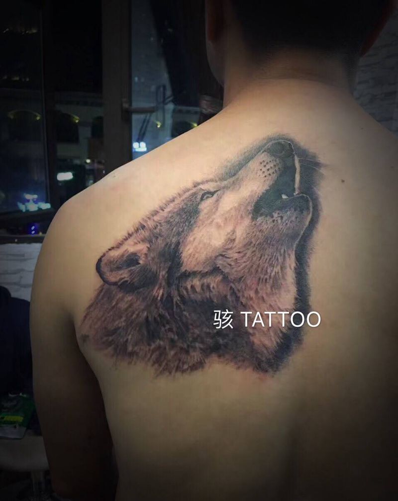 《啸》纹身图片_肩部欧美写实狼纹身图案