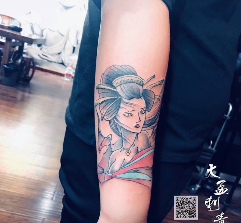 当前位置: 首页 >河南省郑州市纹身店-大孟刺青工作室纹身图案>小臂艺妓纹身图片_成品原创传统纹身图案