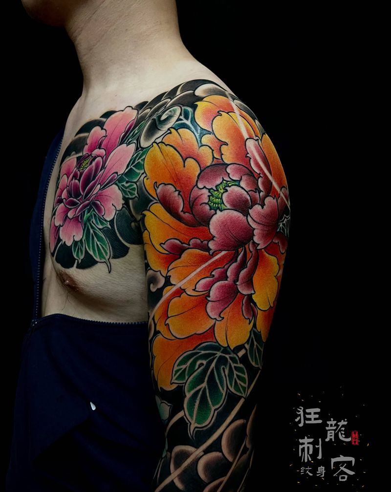 当前位置: 首页 >河南省郑州市纹身店-狂龙刺客纹身工作室纹身图案>传统重彩双半甲纹身图片_胸部手臂老传统新传统菊花半甲传统半甲牡丹半甲纹身图案