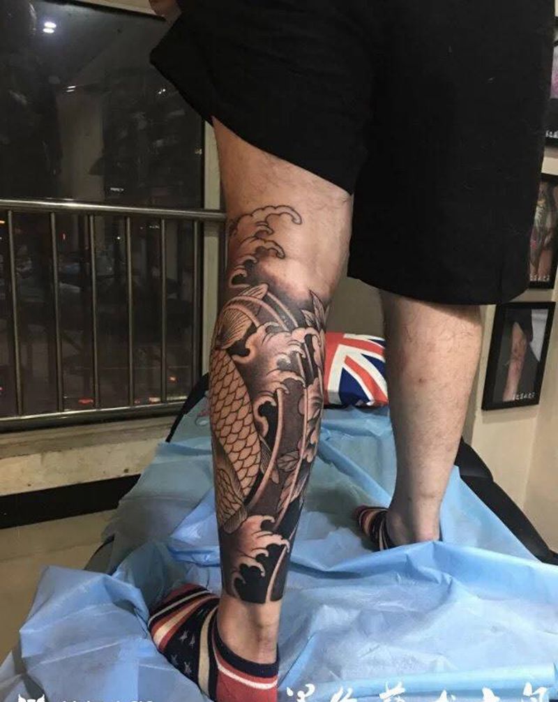 当前位置: 首页 >河南省郑州市纹身店-墨色刺青纹身图案>鲤鱼包小腿背景完成纹身图片