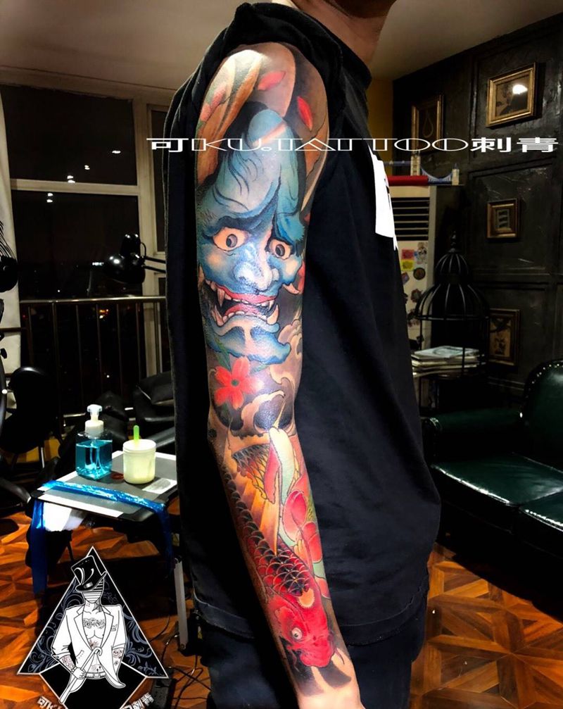 当前位置: 首页 >河南省郑州市纹身店-可KU·tattoo刺青纹身图案>般若锦鲤花臂纹身图片_成品手臂传统鬼神原创花臂纹身图案