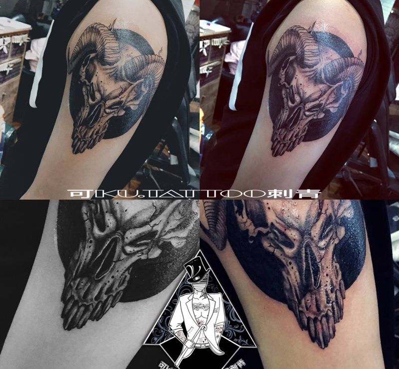 当前位置: 首页 >河南省郑州市纹身店-可KU·tattoo刺青纹身图案>羊头纹身图片_成品手臂欧美写实清新植物图腾鬼神动物纹身图案