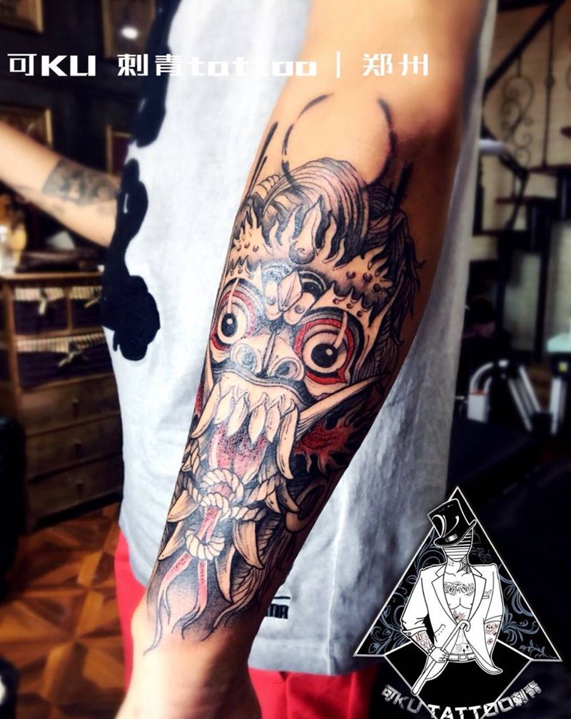 当前位置: 首页 >河南省郑州市纹身店-可KU·tattoo刺青纹身图案>小臂外侧纹身图片_成品手臂欧美传统鬼神图腾人物纹身图案