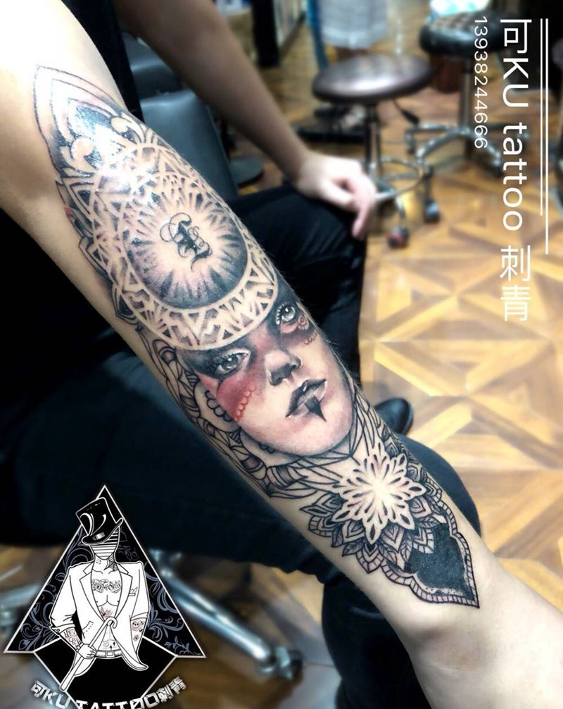 当前位置: 首页 >河南省郑州市纹身店-可KU·tattoo刺青纹身图案>无名纹身图片_成品手臂欧美写实人物图腾原创纹身图案
