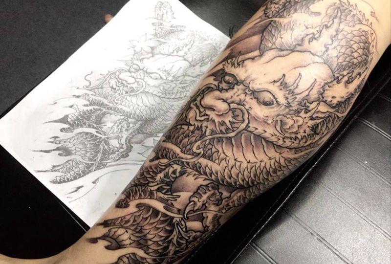 • T网红王老大花腿龙纹身图片_腿部新传统纹身图案