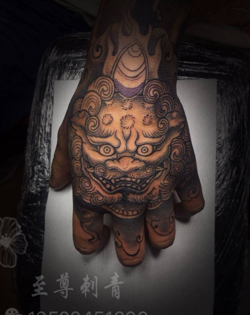 手背唐狮纹身图片_新传统纹身图案