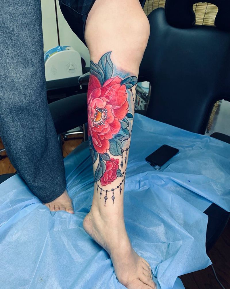 牡丹纹身图片_腿部新传统牡丹花纹身图案