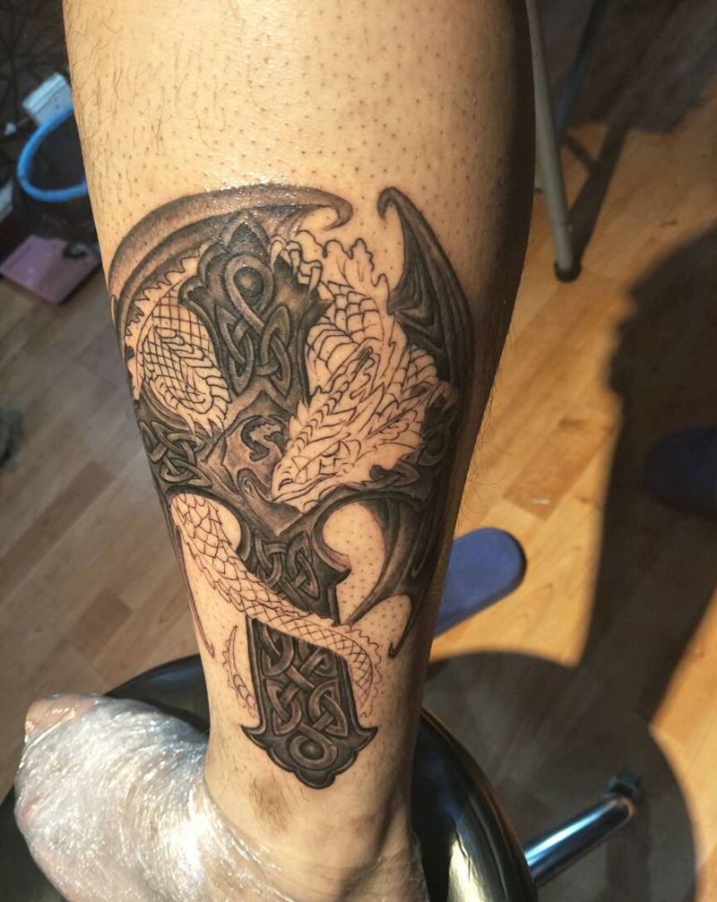 • T网红王老大花腿龙纹身图片_腿部新传统纹身图案