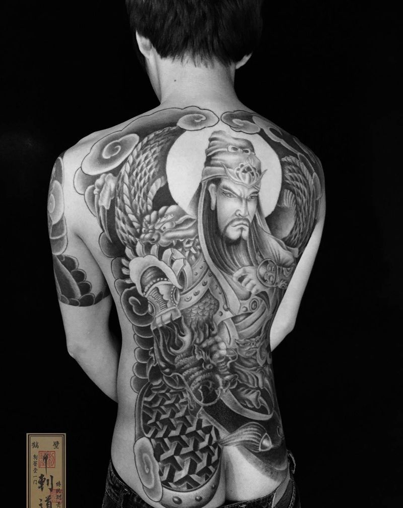 当前位置: 首页 >河南省鹤壁市纹身店-刺艺堂—刺道纹身图案>关公纹身图片_成品背部传统写实肖像人物宗教鬼神清新肩部纹身图案