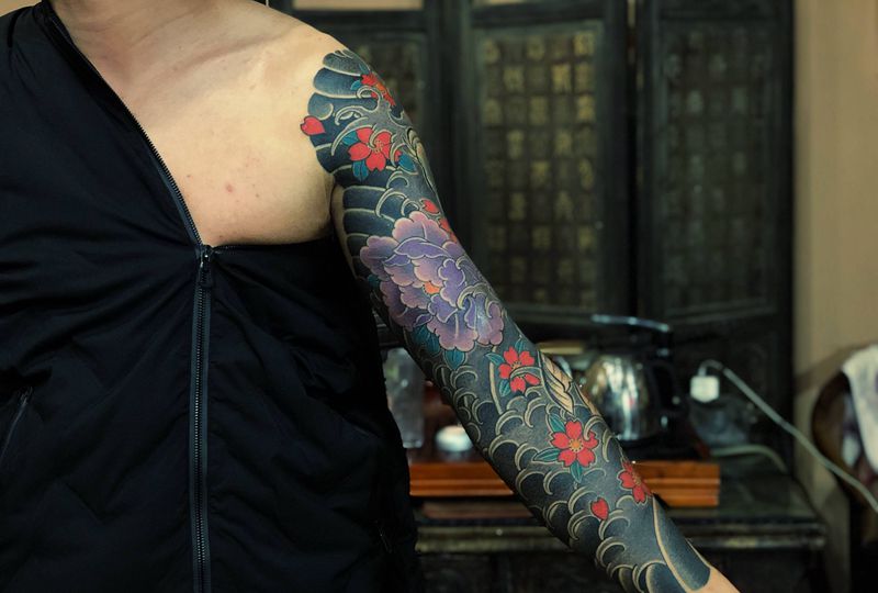 当前位置: 首页 >河南省鹤壁市纹身店-刺艺堂—刺道纹身图案>满足你们 八百元的花臂~[让我纹身图片_老传统纹身图案
