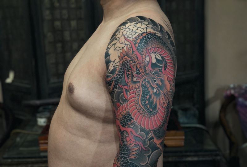 • T网红王老大花腿龙纹身图片_腿部新传统纹身图案