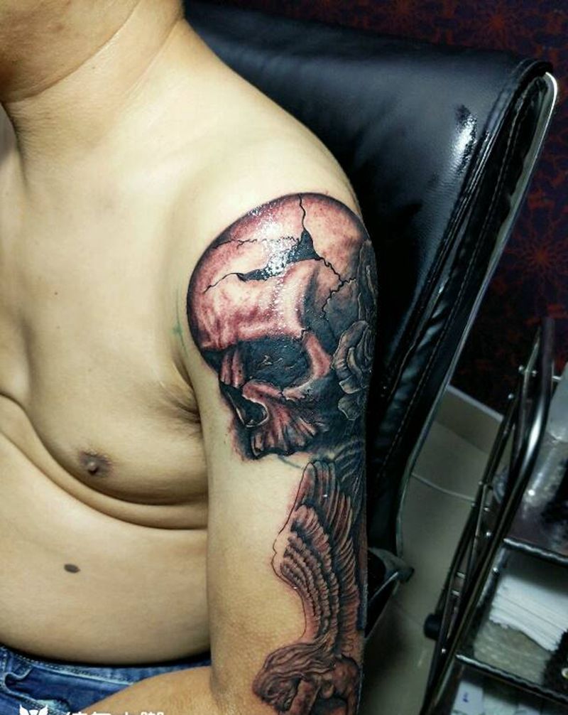 骷髅天使纹身图片_肩部背部手臂腿部欧美人物鬼神骷髅天使成品纹身图案