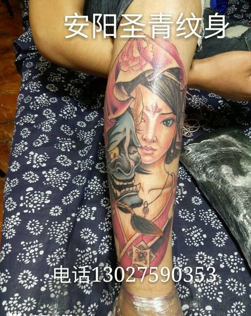 当前位置: 首页 >河南省安阳市纹身店-安阳圣青纹身工作室纹身图案>小腿,彩色艺姬完成纹身图片