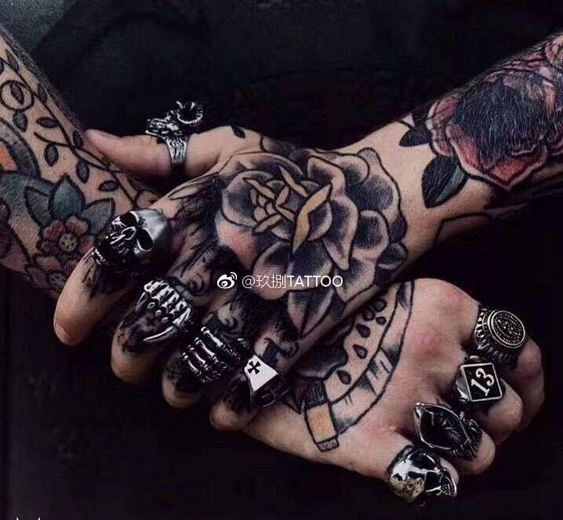 • 手背潮流时尚的玫瑰花眼睛纹身图案