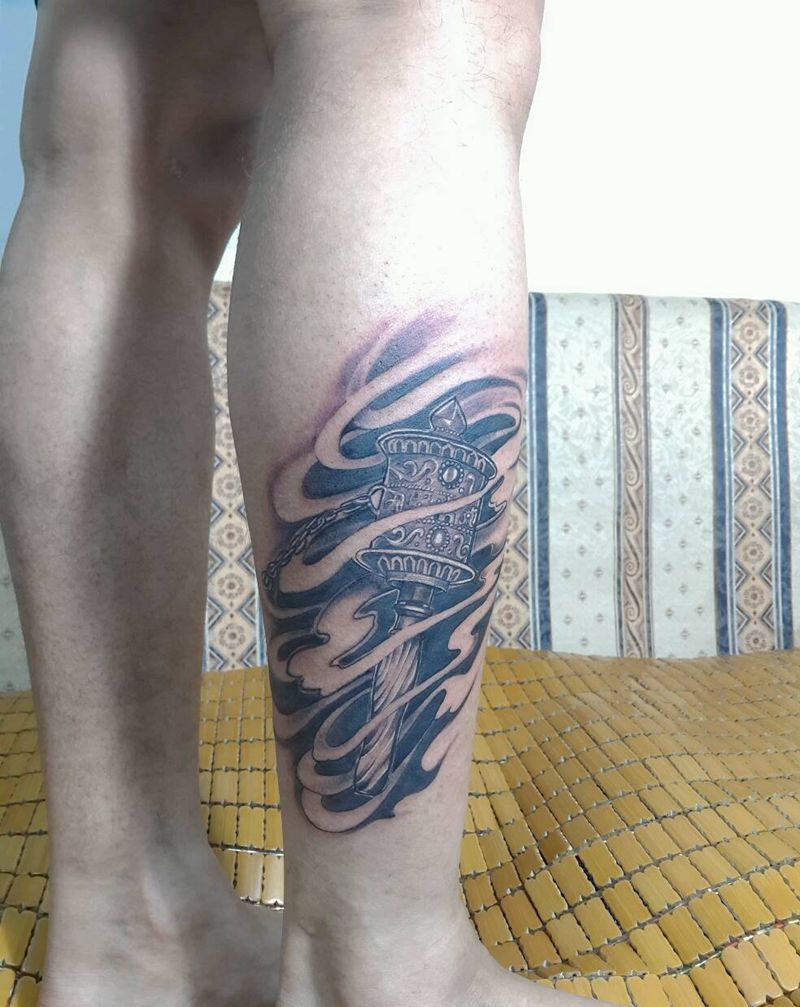 • T包小腿吹火男+阿多福纹身图片_腿部老传统新传统吹火男阿