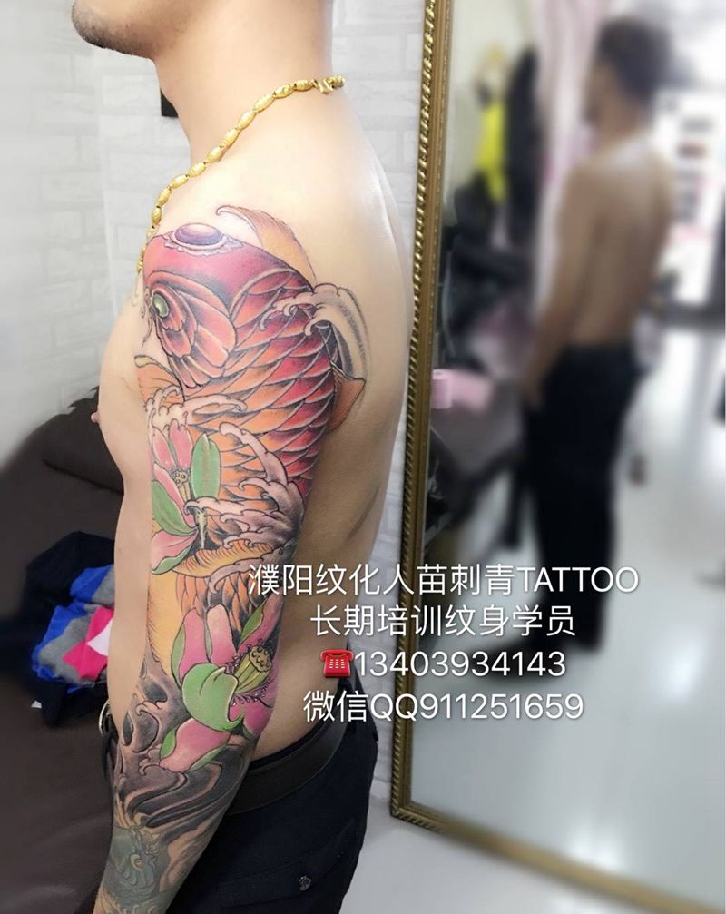 当前位置: 首页 >河南省濮阳市纹身店-纹化人苗刺青TATTOO纹身图案>彩色招财锦鲤花臂纹身图片
