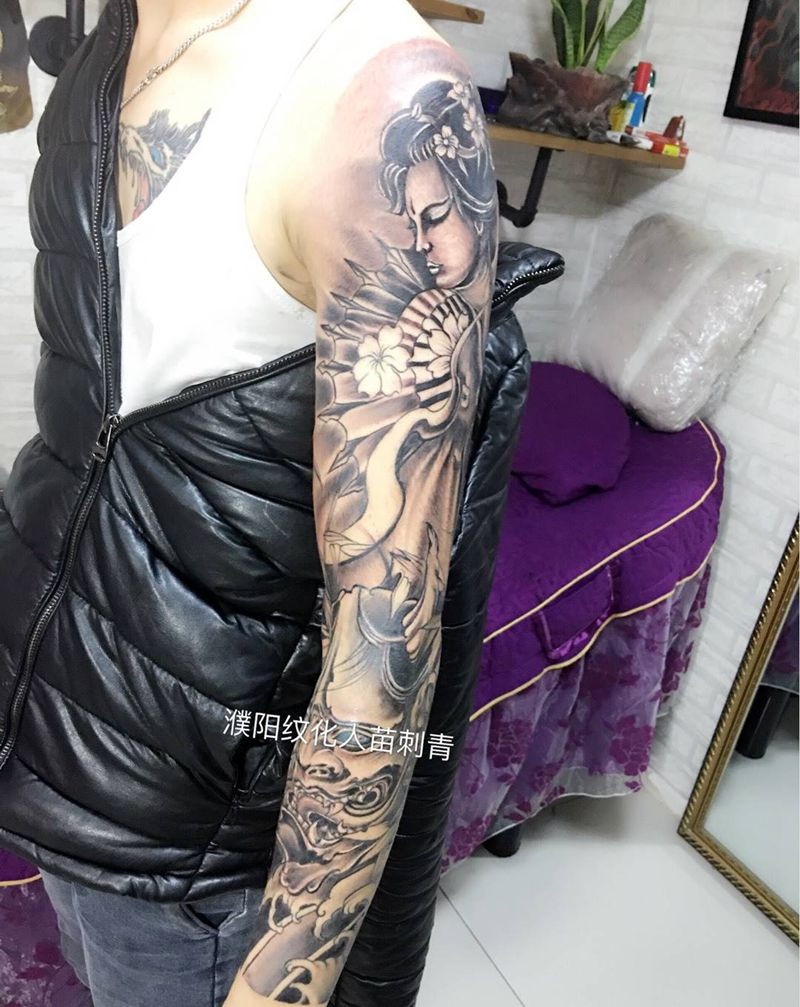 当前位置: 首页 >河南省濮阳市纹身店-纹化人苗刺青TATTOO纹身图案>艺妓黑灰花臂纹身图片
