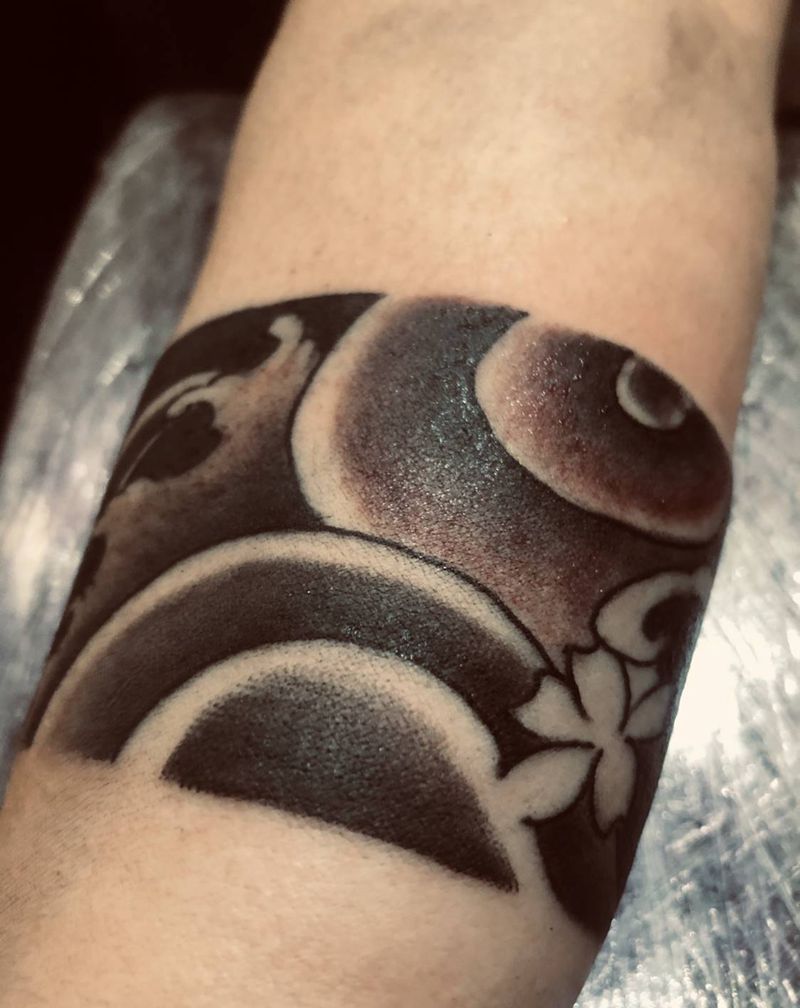 当前位置: 首页 >河南省濮阳市纹身店-濮阳墨客刺青(纹身培训)纹身图案>即兴设计臂环纹身图片_手臂手部新传统纹身图案