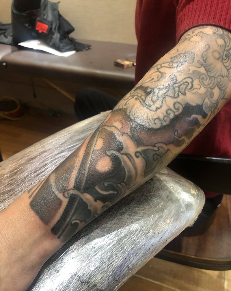 当前位置: 首页 >河南省濮阳市纹身店-濮阳墨客刺青(纹身培训)纹身图案>修改花臂未完。纹身图片_手臂肩部新传统纹身图案