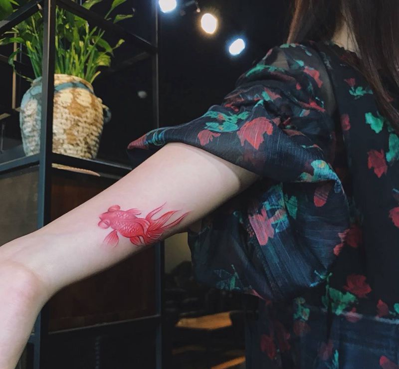 当前位置: 首页 >河南省许昌市纹身店-沄刺青工作室纹身图案>金鱼纹身图片_成品手臂传统清新动物纹身图案