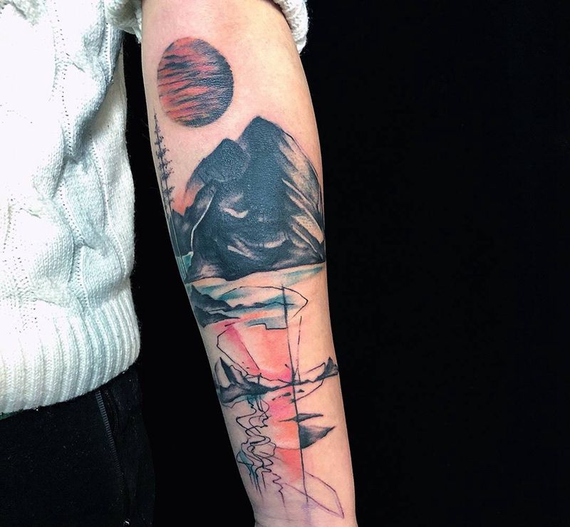 山水纹身图片_手臂水彩纹身图案