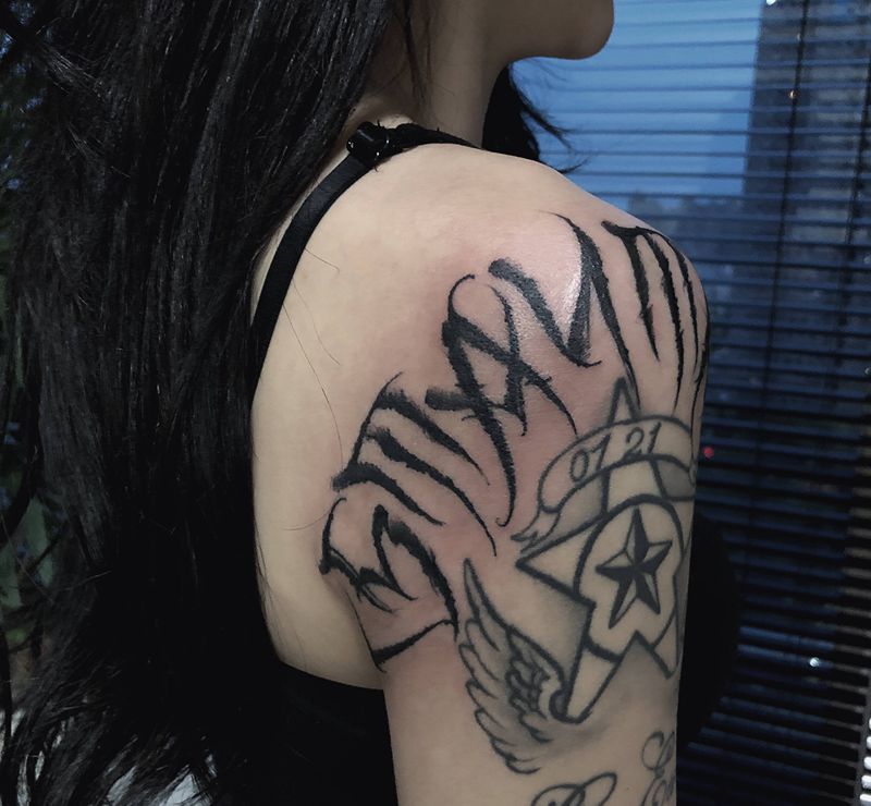 当前位置: 首页 >河南省许昌市纹身店-沄刺青工作室纹身图案>stay true纹身图片_肩部花体字纹身图案