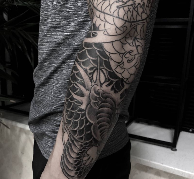 • T网红王老大花腿龙纹身图片_腿部新传统纹身图案