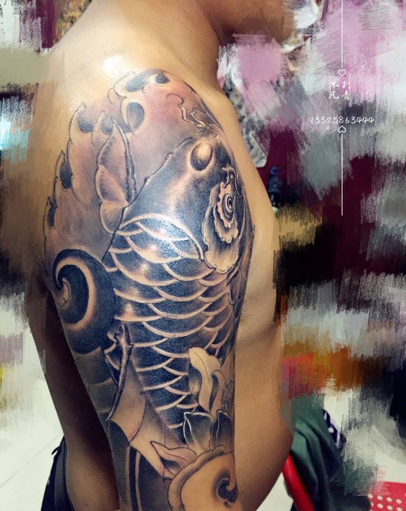 大臂鲤鱼纹身图片_成品肩部手臂传统动物鲤鱼纹身图案