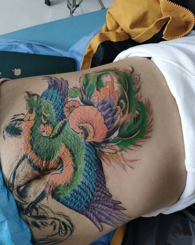 凤凰纹身图片_腹部新传统彩色凤凰纹身图案