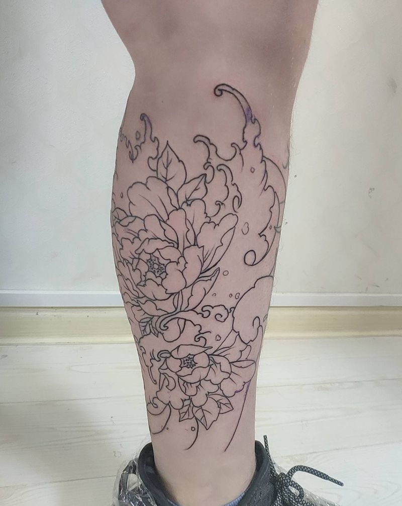 牡丹纹身图片_腿部新传统纹身图案