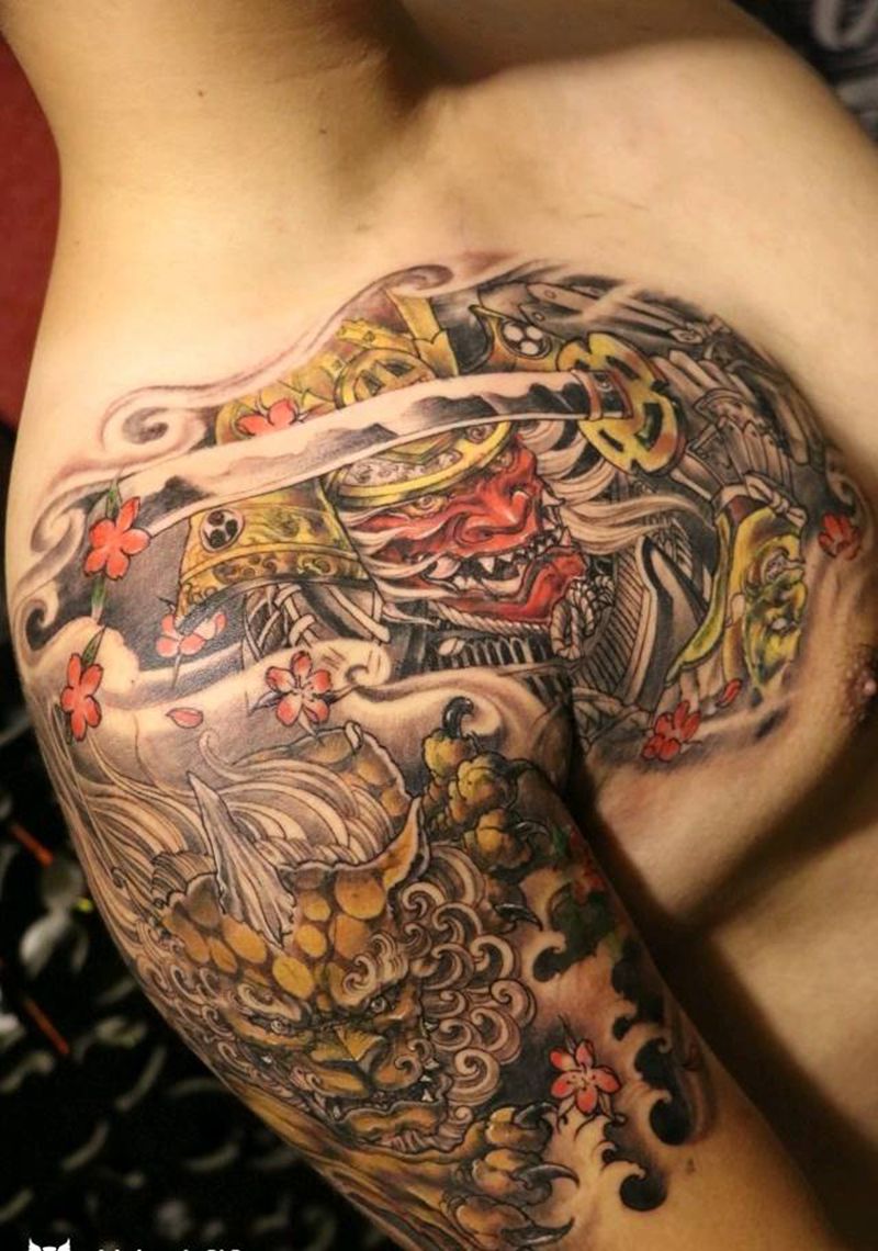 半甲武士纹身图片_肩部胸部传统写实人物鬼神武汉成品纹身图案