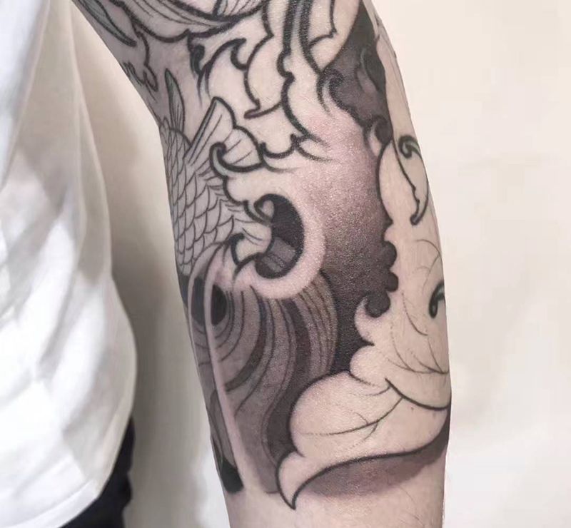 鲤鱼七分袖花臂 割线纹身图片_手部手臂老传统新传统鱼花海浪纹身图案