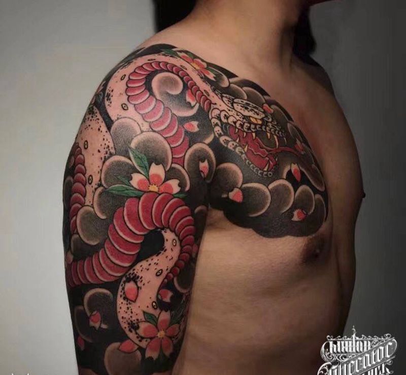 当前位置: 首页 >湖北省武汉市纹身店-Liberator Tattoo纹身图案>蛇与樱花纹身图片_手臂胸部老传统新传统蛇樱花纹身图案