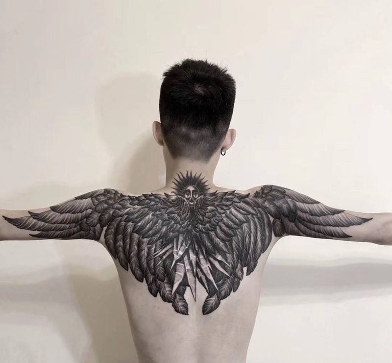 半背翅膀纹身图片_肩部背部点刺欧美写实翅膀太阳纹身图案