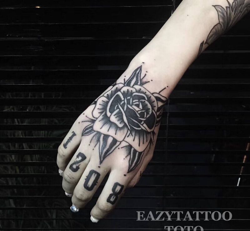 • 手背潮流时尚的玫瑰花眼睛纹身图案