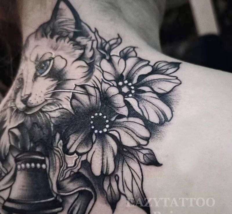 一只猫的故事纹身图片_颈部背部New School猫遮盖花纹身图案