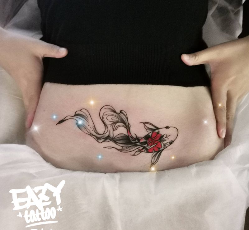 金鱼遮盖纹身图片_腹部水彩鱼纹身图案