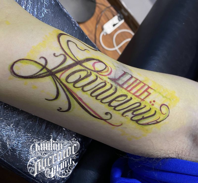 当前位置: 首页 >湖北省武汉市纹身店-Liberator Tattoo纹身图案>花体字纹身图片_手臂花体字花体字纹身图案