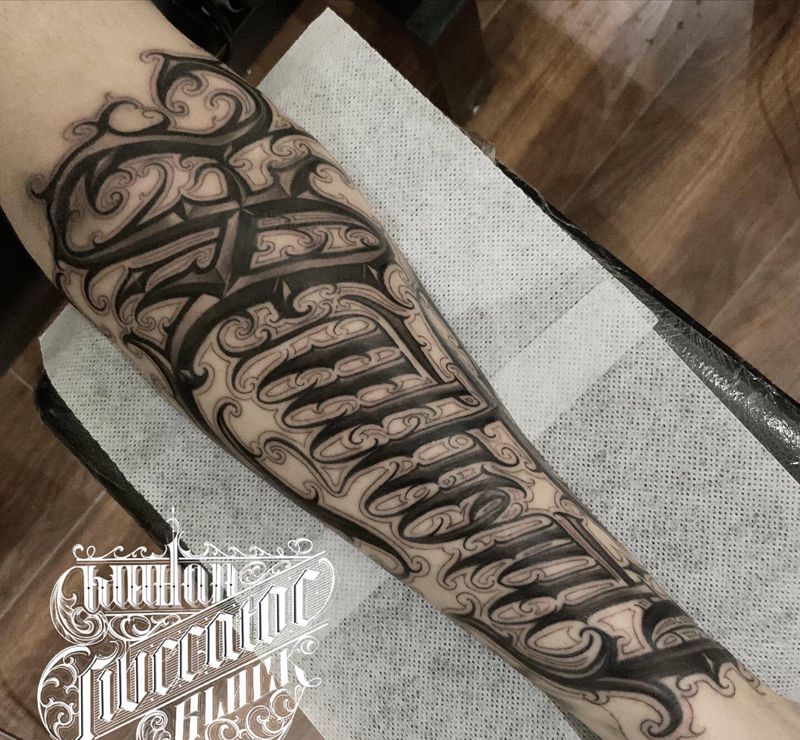 当前位置: 首页 >湖北省武汉市纹身店-Liberator Tattoo纹身图案>花体纹身图片_手臂花体字花体字纹身图案