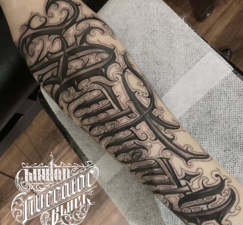 当前位置: 首页 >湖北省武汉市纹身店-Liberator Tattoo纹身图案>花体纹身图片_手臂花体字花体字纹身图案