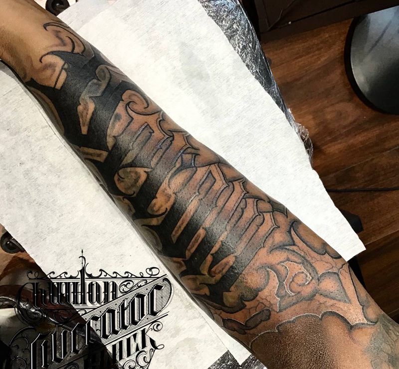 当前位置: 首页 >湖北省武汉市纹身店-Liberator Tattoo纹身图案>花体字遮盖纹身图片_手臂花体字花体字纹身图案
