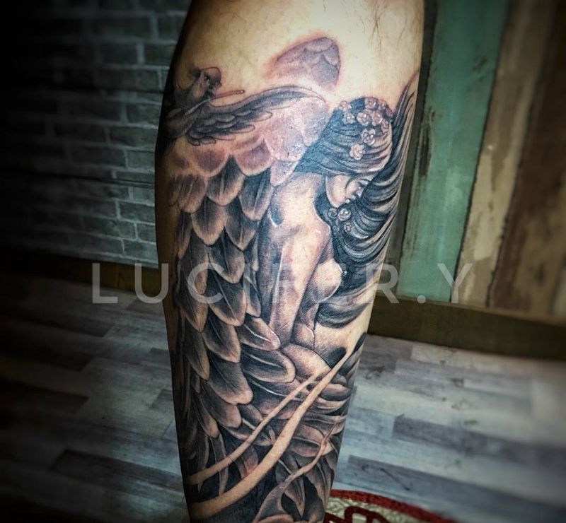 当前位置: 首页 >湖北省武汉市纹身店-炎刺青纹身图案>包小腿,天使恶魔纹身图片_成品腿部欧美人物鬼神纹身图案