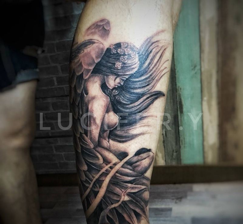 当前位置: 首页 >湖北省武汉市纹身店-炎刺青纹身图案>包小腿,天使恶魔纹身图片_成品腿部欧美人物鬼神纹身图案